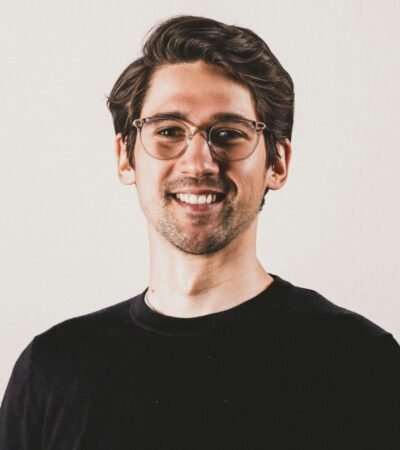 A person stands in a professional setting holding a blue folder. They are wearing a teal blazer over a white shirt and jeans. The background features glass walls and what appears to be a server room with blue lighting, suggesting a technological or business environment.